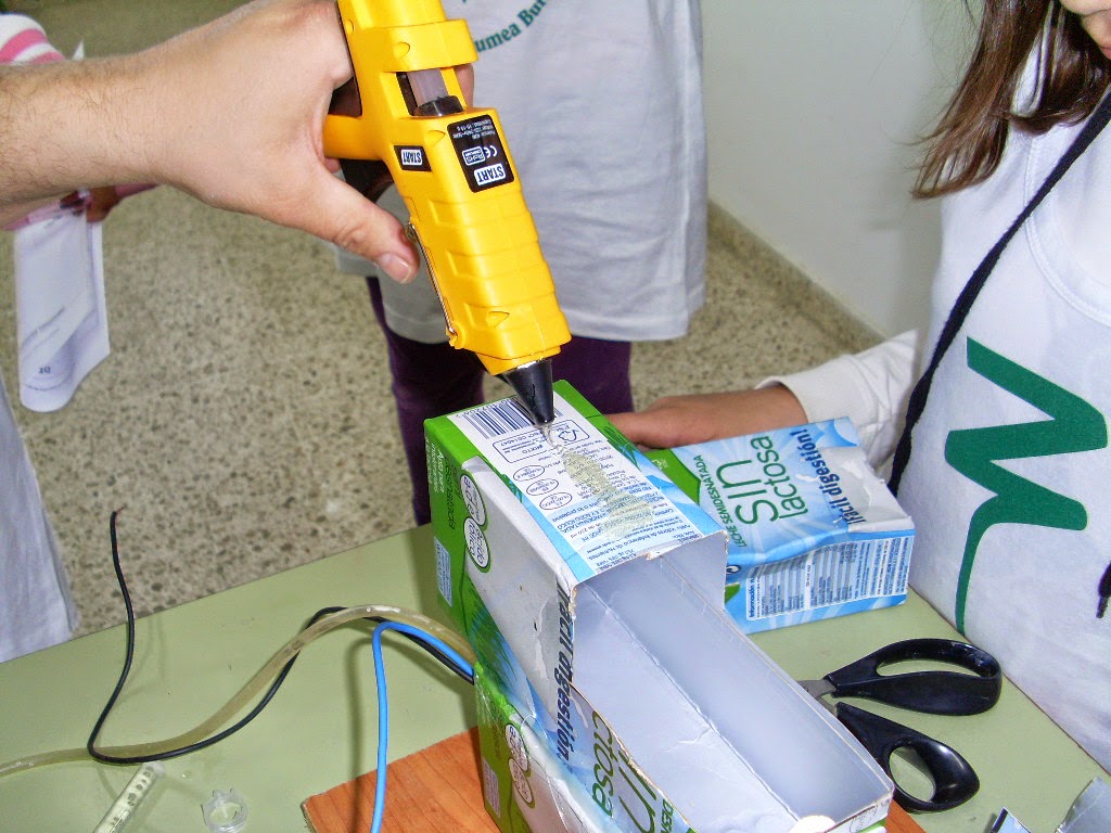 Estos primeros experimentos, dado el limitado número de sesiones y la peligrosidad de algunas de sus fases, nos hizo tomar la decisión de llevar las bombas de agua ya completadas, aunque nuestra persona experta, Javier, detalló la fabricación de las mismas, a partir de tapones plásticos, motorcitos de juguete y una pila de petaca. Así como la preparación de la base para la fuente, y la perforación de la tierra para el estanque, que requiere mayor fuerza bruta.